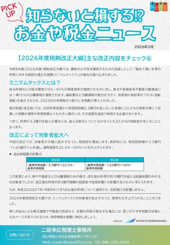 2026年度税制改正大綱では、ミニマムタックスの対象者が拡大するうえ、税率も引き上げられることとなりました。